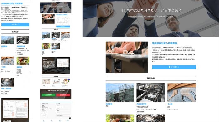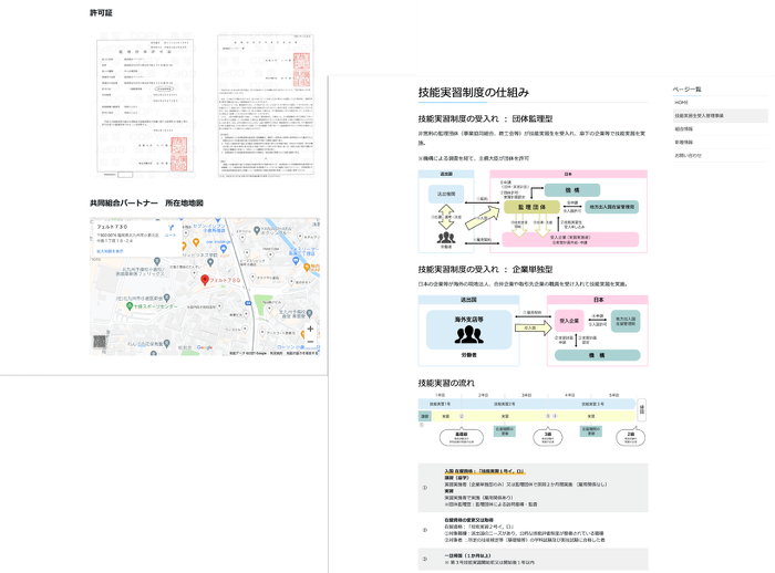 オプション料金を12ヶ月間お支払いいただくことでお客様のホームページに必要な機能を追加いたします。本コーポレートサイトは標準メニュー(オプション追加なし)で制作しており、「技能実習制度の仕組み」など複雑な内容は固定ページを設けてわかりやすく図解しています。